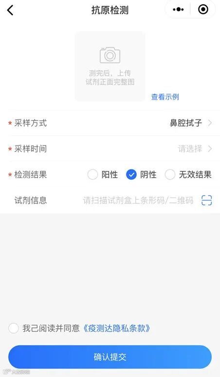 上传检测试剂结果照片,填写采样方式、采样时间、检测结果(阳性/阴性/无效结果)、试剂信息(如抗原检测试剂盒上没有二维码则无需填写),仔细阅读《疫测达隐私条款》,点击勾选“我已阅读并同意《条款》”,再点击确认提交。