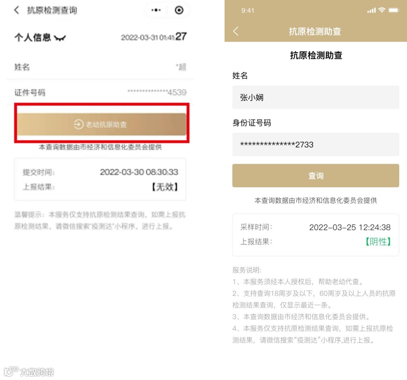 2、老幼助查。点击老幼抗原助查按钮,输入“姓名+身份证号”可帮助家中老人和小孩进行结果查询。