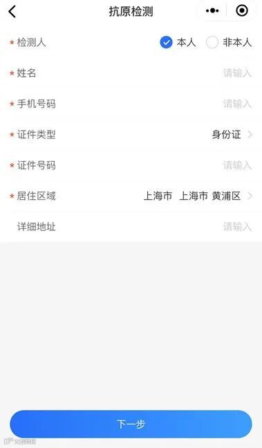 点击“去记录”,填写信息:检测人(本人/非本人)、姓名、手机号码、证件类型及号码、采样地址,点击下一步。