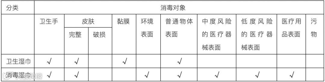 依据我国行业标准WS 575-2017《卫生湿巾卫生要求》,卫生湿巾适用于手、皮肤、黏膜及普通物体表面的清洁杀菌。消毒湿巾的适用范围主要依据由中国卫生监督协会发布的团体标准T/WSJD 001-2019《载体消毒剂卫生要求》,该类湿巾也适用于手与完整的皮肤,但不适用于黏膜,另外更适用于环境表面、中低度风险的医疗器械表面及医疗用品表面消毒。