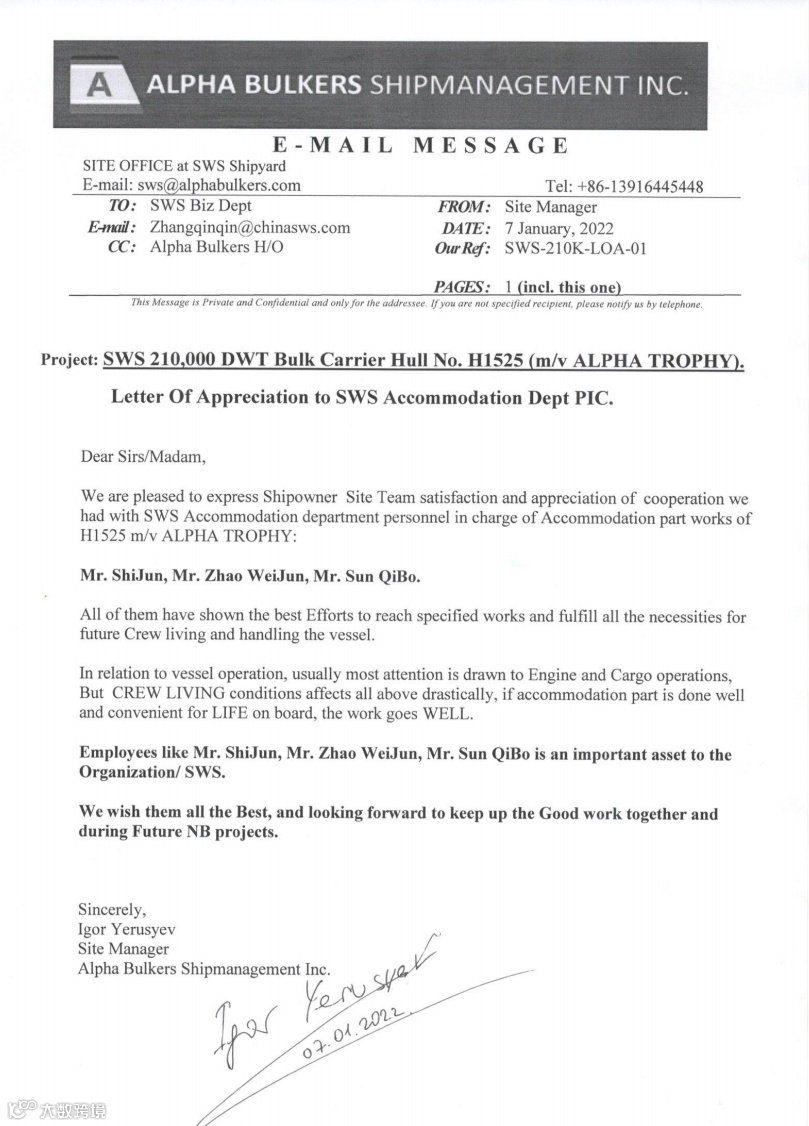 1月1日,外高桥造船为希腊阿尔法(ALPHA)船东建造的21万吨纽卡斯尔型散货船“ALPHA TROPHY”号(H1525船)签字交付之际,驻厂船东经理为公司模块部写来了一封表扬信,向辛勤参与该船上建制造的工作人员表示衷心的感谢与真诚的赞扬。