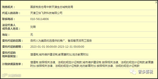 同样,天津三快飞跃科技有限公司获国家税务总局中新天津生态城税务局签发的委托代征证书,范围是自然人为美团优选提供的推广、售后等灵活用工服务,期限为今年一整年。该公司为美团香港有限公司的三级子公司。