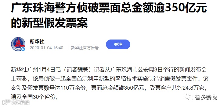 此前,一起假发票案引发人们的强烈关注,原因便是此案涉及的金额实在过大——超过350亿元:广东珠海市公安局侦破一起全国首宗利用新型的网络技术实施制造销售假发票案件,涉及假发票数量达110万余份,票面总金额逾350亿元,受票客户共约24.8万家,遍及全国30个省份。目前,所有受票企业都正在被各地税务机关一一追查。