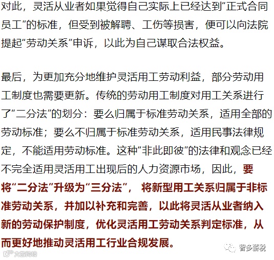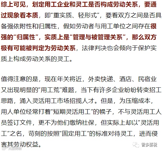 真正的灵活用工是灵活从业人员与用工企业构成合作关系,而不是雇佣关系。但是,这种合作关系的界限很微妙,即使是平等合作,但公司仍处于派发工作的“上方”,而灵活用工更多的是被动地在“下方”接受工作,而如果这种依附性过强,形成较强的“归属性”,那么灵活用工下的劳务关系很容易转变成劳动关系。比如上述案例一,刘某始终和配送中心保持了强联系,所以大概率会被司法机关认定为双方构成劳动关系。