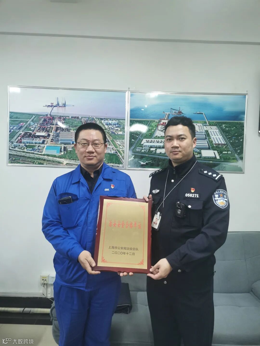 4月12日,芦潮港派出所代表上海市公安局治安总队送来“2020年度上海市治安安全合格单位”奖牌,并对公司表示祝贺。
