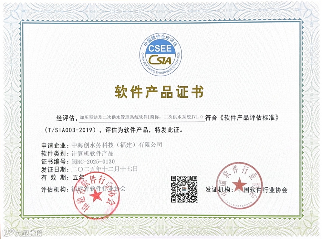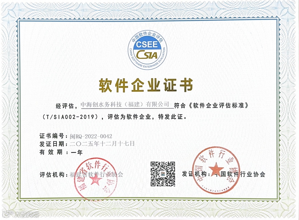 近日,中海创水务科技凭借卓越的软件研发能力和创新成功,顺利通过福建省软件行业协会认定的【双软企业】,再次获得【软件企业证书】及【软件产品证书】。这标志中海创水务科技在软件技术研发与应用领域的专业技术实力和综合服务能力再次获得业内权威认可,成为国内优秀的智慧水业软件产品设计、研发、销售、运营为一体的软件企业!