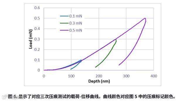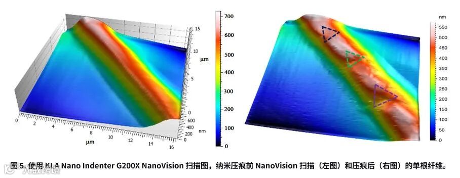 图5显示了两张16µm x 16µm的N95口罩熔喷微纤维的NanoVision扫描图。左图显示了在纳米压痕前微纤维和环氧树脂的表面,而右图显示了在纤维上进行最大载荷分别为0.1mN、0.3mN和0.5mN的三次纳米压痕测试后的同一区域。两幅图清楚地展示了NanoVision选项在高精度定位和高分辨率成像的能力。