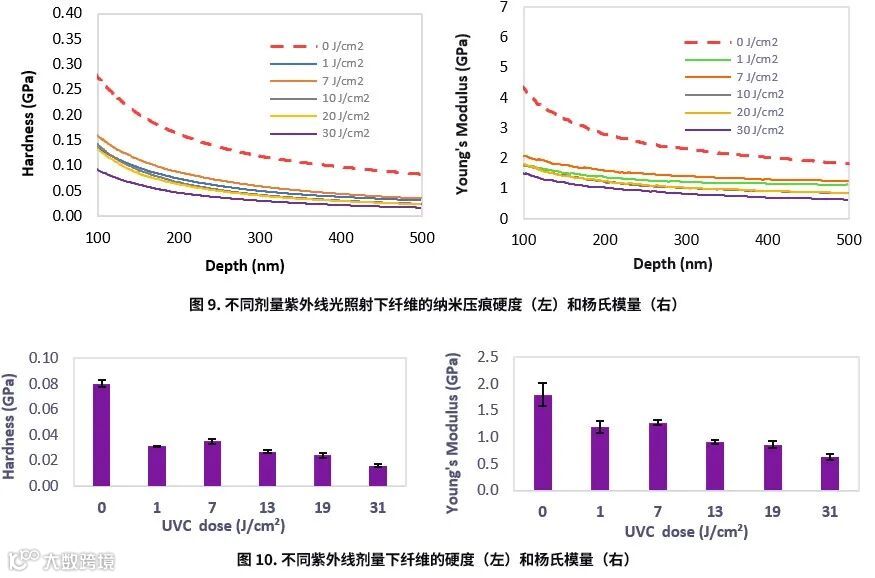 图9显示了五种剂量下的压痕硬度(左图)和杨氏模量(右图)随深度变化的连续函数。图10显示了五种不同紫外线剂量下,在500nm压痕深度处纤维的硬度(左图)和杨氏模量(右图),此时这些数值已经基本稳定。观察到的紫外线剂量与纤维硬度和模量下降之间的关系,与此前关于聚丙烯纤维紫外线敏感性的研究结果一致。先前已有报道表明,纤维特别容易受到紫外线损伤。在紫外光的作用下,它会经历光氧化降解,这是由于聚丙烯主分子链的断裂,导致变脆以及抗拉强度、冲击强度和延伸强度的丧失。剂量较低的1J/cm²到7J/cm²范围是否偏离了剂量与硬度/模量之间的变化关系,还需要进一步研究。