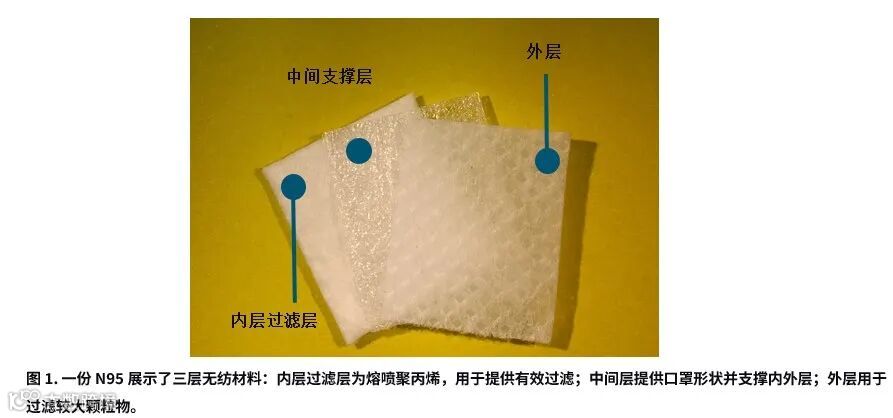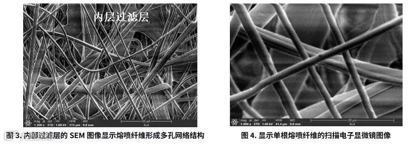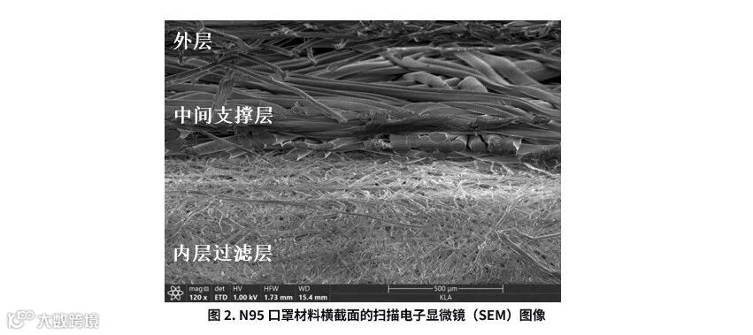 N95口罩是保护前线医护人员的关键防护装备之一。 N95口罩通常由多层过滤材料组成,包括图1所示的各层,其中内层过滤层被认为是关键功能组件。这一层由熔喷无纺布制成,由成千上万根非常细且不连续的微纤维组成。纤维上的电荷使过滤效率提高了10倍,这是因为在制造过程中对N95过滤层采用了一种叫做静电充电的技术。图2显示了主要过滤层的扫描电镜(SEM)图片。