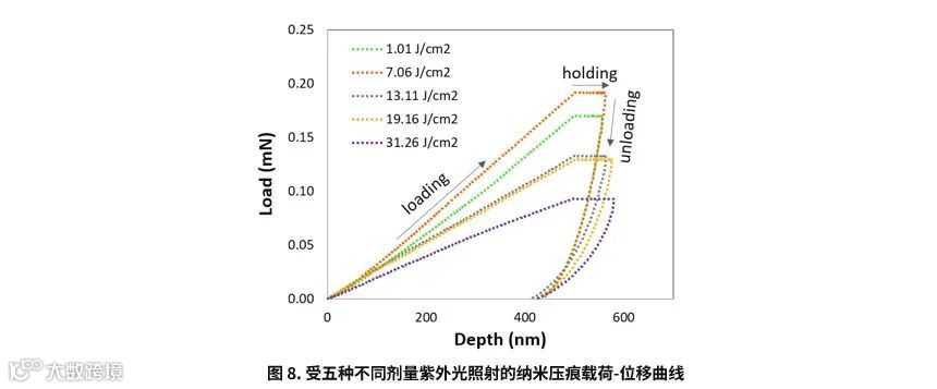 图 8 显示了五种不同紫外线剂量下纤维的纳米压入载荷-位移曲线。五个样品的压入响应有一个明显的差异,即加载和保载阶段的位移。总体而言,当紫外线剂量较高时,曲线略微向右移动,而在相同压入深度下的最大载荷显著降低。较高剂量下纤维的物理变化在硬度和杨氏模量的结果中得以体现。