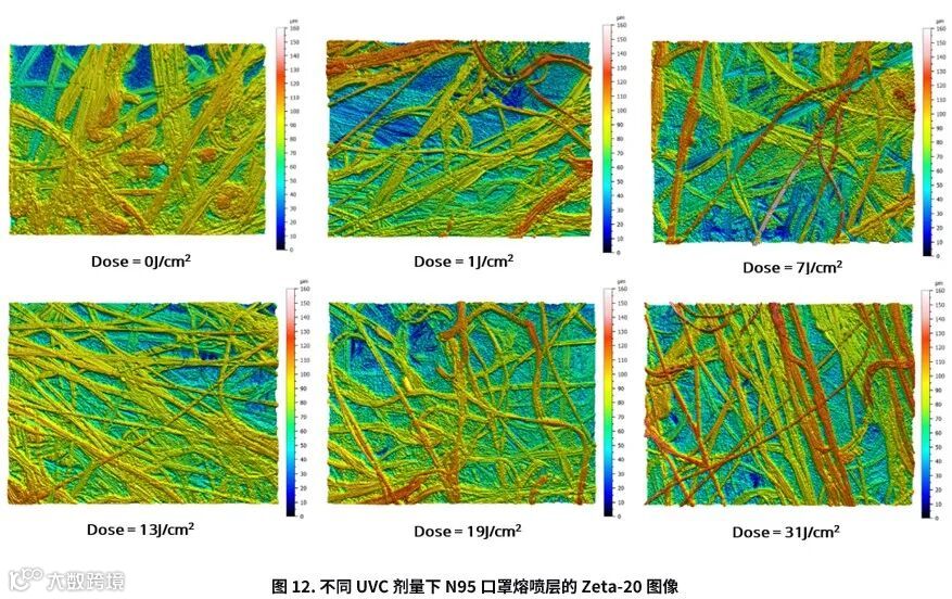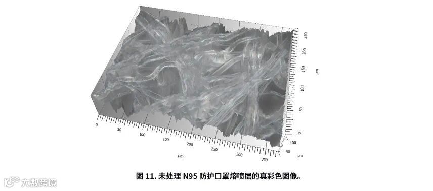 图11显示了未经过紫外线处理的N95口罩熔喷层的三维Zeta图像。未经处理的纤维看起来缠结且尺寸和形状各异,有些纤维结合形成较大的束状结构。由于纤维的半透明性以及深色背景,这幅真实色彩图像整体上看起来主要是灰度的。
