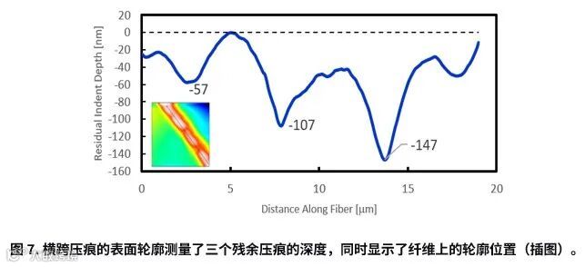 图6显示了三次测试的载荷-位移曲线,每条曲线的颜色对应图5中的标记。在卸载段观察到压痕的弹性恢复,从而产生不同的残余位移。利用三维扫描探针显微镜(SPM)图像,还根据沿纤维纵向的表面轮廓测量了残余压痕的尺寸和深度。残余深度的测量结果如图7所示,其中载荷为0.1mN、0.3mN和0.5mN时,残余压痕深度分别为57nm、107nm和147nm,这与压痕载荷和深度曲线一致。图7中的插入图显示了纤维上轮廓的位置。