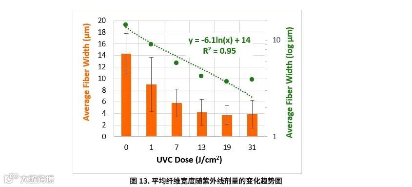 纤维宽度分析通过从三维图像中随机选取25根纤维并测量其宽度得出。图13显示了平均纤维宽度随紫外线剂量的变化。数据显示,在紫外线剂量为1J/cm²时,平均纤维宽度下降了37%,并持续下降直到剂量达到19J/cm²。在0 - 19J/cm²剂量范围内,宽度数据表现出随剂量强烈且规则的对数下降,R² = 0.95(在0 - 13J/cm²剂量范围内,R² = 0.99)。在31 J/cm²剂量时,该趋势达到饱和,未观察到进一步的下降。每25次测量的平均值中纤维宽度的变异也较大,这种变化可归因于熔喷纤维的波纹性和不均匀性。
