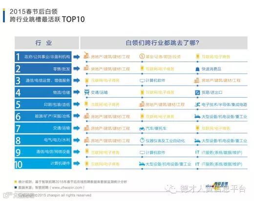 近年来,在人才跨界的大趋势下,白领们跨行业流动成为一种现象。春节后在线投递数据显示,政府/公共事业/非盈利机构、零售/批发、通信/电信运营、增值服务等行业白领跨界跳槽最活跃。多数白领跨界跳槽选择了房地产、互联网/电子商务等行业。