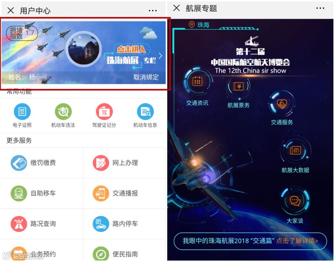 为了方便广大市民观众了解航展交通咨询,交警部门在“珠海交警”微信公众平台开设了“2018航展交通专题”,有航展交通资讯、航展票务、交通服务(市内外专线车及乘车预约)、航展大数据、大家谈等栏目,交警部门会实时更新航展最新交通资讯,购票、乘车也更加方便,欢迎使用。▼