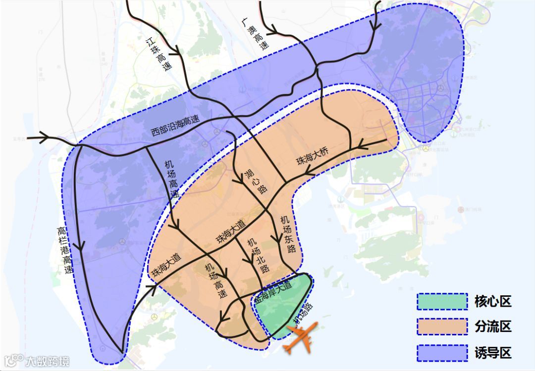 核心区为机场路(金湾路)交金海岸大道路口以西、机场路(金湾路)交机场消防通道路口以东区域,原则上只允许持证车辆和公共交通工具(含常规公交、专线大巴、接驳大巴、旅游大巴、出租车,下同)进入。