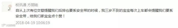 在每个阶段,交警微信都连续发文,反复进行宣传提醒,小编也欣喜地看到,后排系安全带已经逐渐成为珠海的文明交通品牌,开始深入人心。很多粉丝给小编留言表示支持,还有热心粉丝留言说:她三岁不到的宝宝每次上车前都提醒大家要记得系安全带,让她倍感自豪。▼
