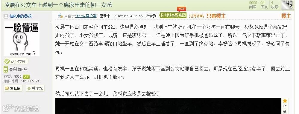 而发生在终点站的这一幕,恰好被在艮山门东站乘坐221路的网友“抽风中的葵花”目睹,“真是多亏了这个负责的司机,如果真让孩子自己一个人半夜回家真不知道会发生什么。杭州很温暖。”