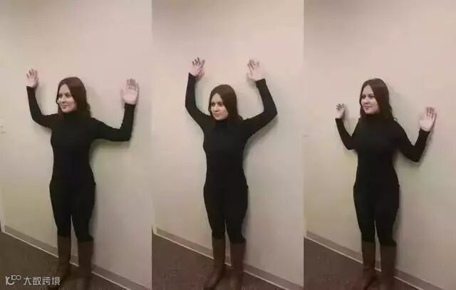 双腿打开呈肩宽,靠墙站立,延展脖子后侧,可以用食指辅助推下巴向后,头靠墙。