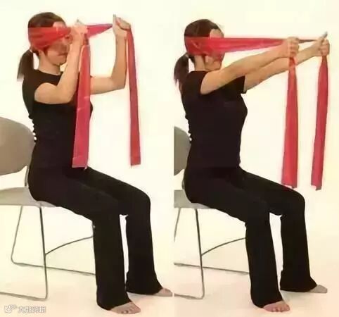 端坐在椅子上,双腿分开与髋同宽,将弹力带套在头部后侧,双手拉住弹力带两端,吸气延展脊柱,呼气双手拉弹力带与颈部形成抗组力量。