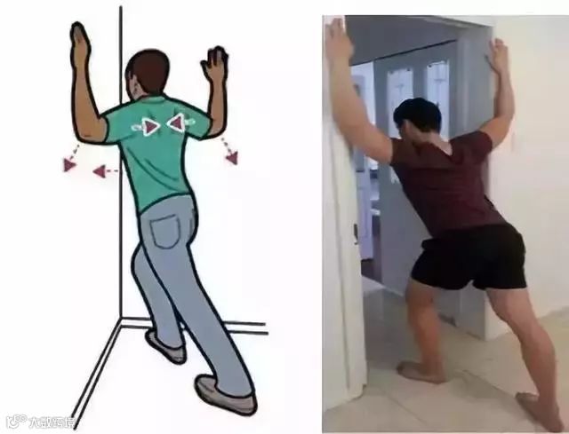 富贵包的形成一般都伴随着头前倾,上交叉综合症,胸椎后凸,因此延展胸椎打开胸腔也非常重要,可以利用墙角或者是门,弓步双手臂推墙面,身体向前,辅助打开胸腔,注意一定要在脊柱的延展的前提下推墙。