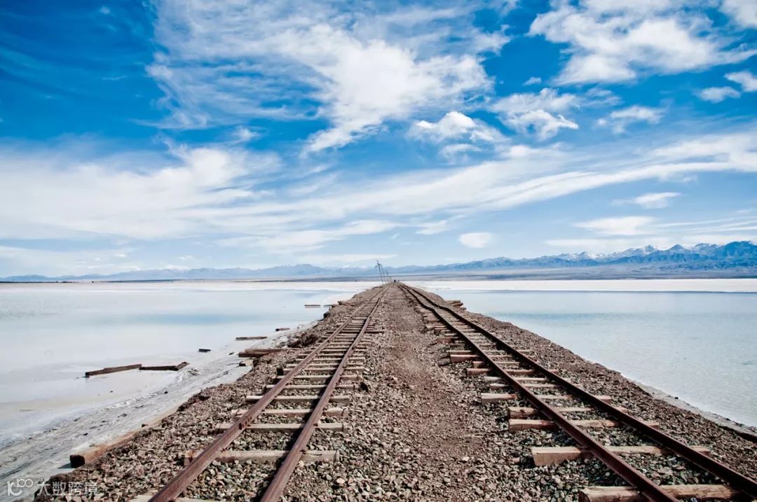 历史遗留下来的铁轨在白茫茫的盐湖中向远方延伸,仿佛通往世界的尽头。