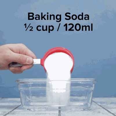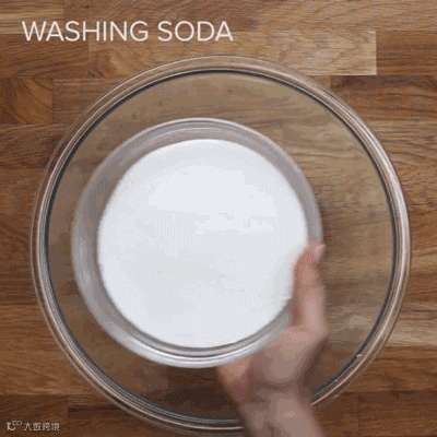 加入一杯小苏打,肥皂碎与小苏打为2:1的比例,再倒入半杯白醋搅拌均匀。这一步还可以加入喜欢的精油,味道也会很好闻哦~