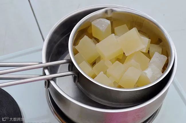 隔水加热肥皂块(或者皂基),直至完全融化成液体状。