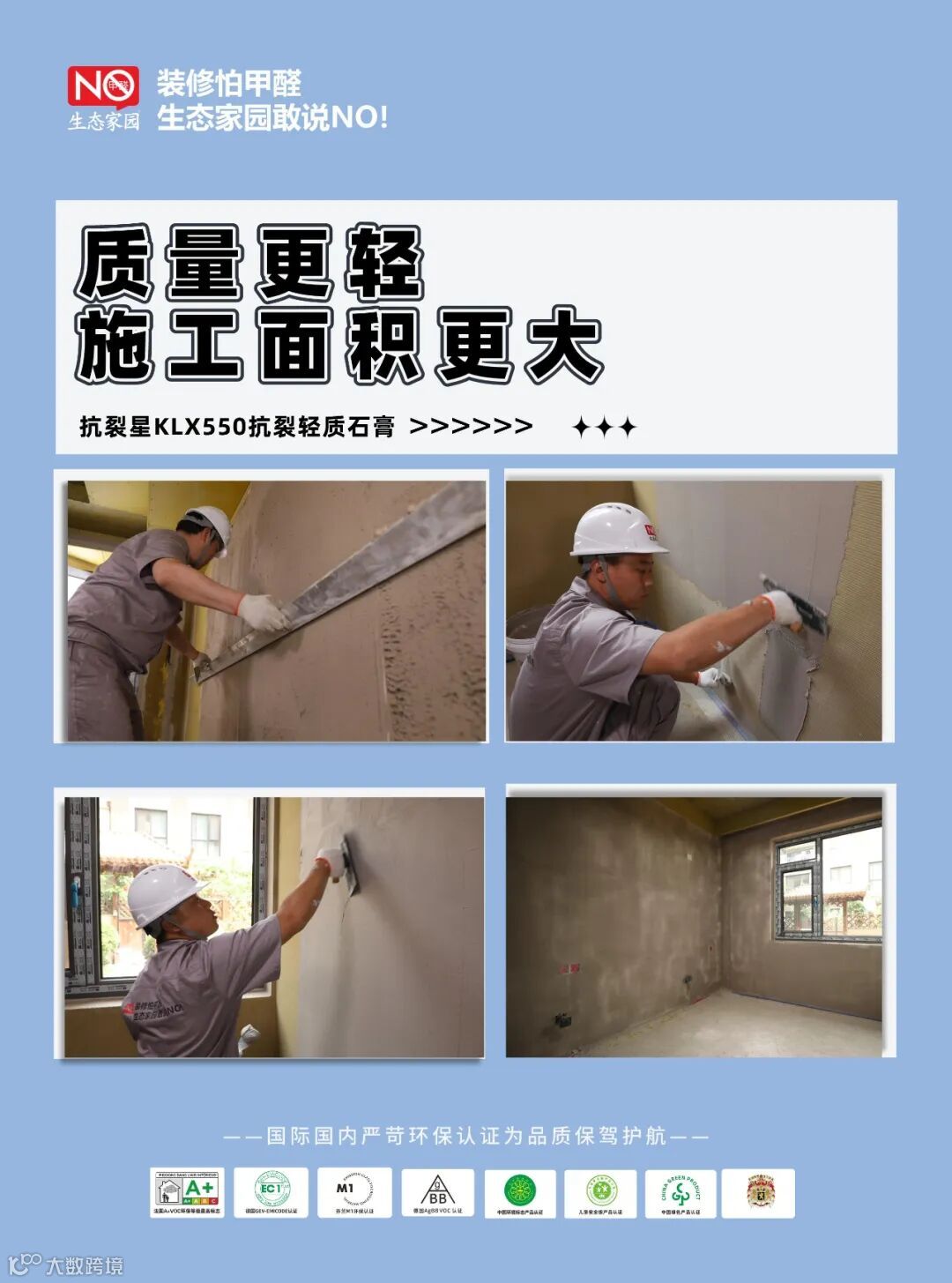 抗裂星KLX550抗裂轻质石膏,一吨的重量可涂布320m2,是普通粉刷石膏的3倍,传统水泥砂浆的4.5倍,相同质量下施工面积更大。