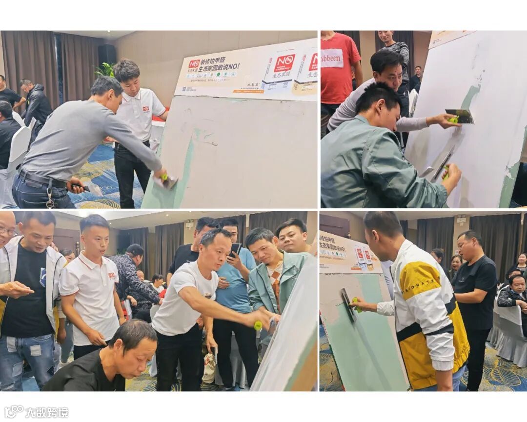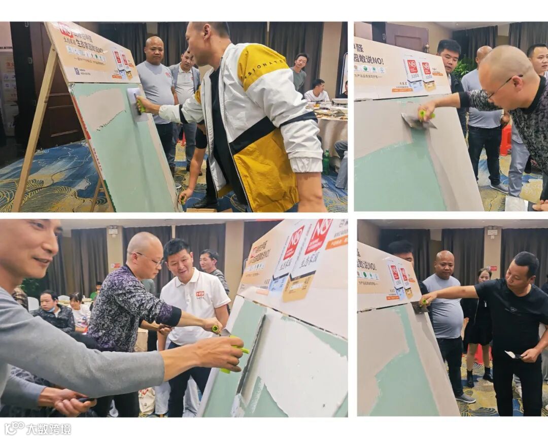 接下来的批刮体验环节,除了大家非常感兴趣抗裂星550抗裂石膏产品外,生态家园新品百囍衬BXC1200艺术漆净味腻子、抗铞宝550生态造毛剂(瓷砖专用)及抗铞宝570生态造毛剂(石膏板专用)等几款产品也接受了大家实地检验,并引发现场的热议。