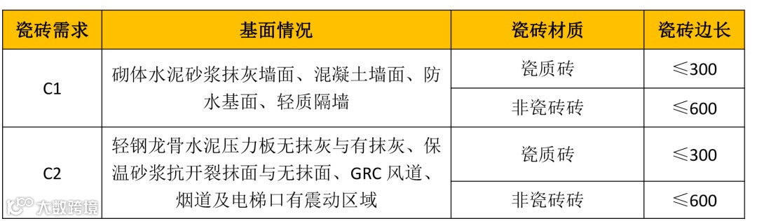 在室内普通墙面和地面铺贴时,C1级的瓷砖胶可以满足基本的使用要求。但在潮湿环境、外墙和地面铺贴时,由于环境的影响,对瓷砖胶的粘结强度要求更高。此时,选择C2级的瓷砖胶能够更好地保证铺贴效果和使用寿命。