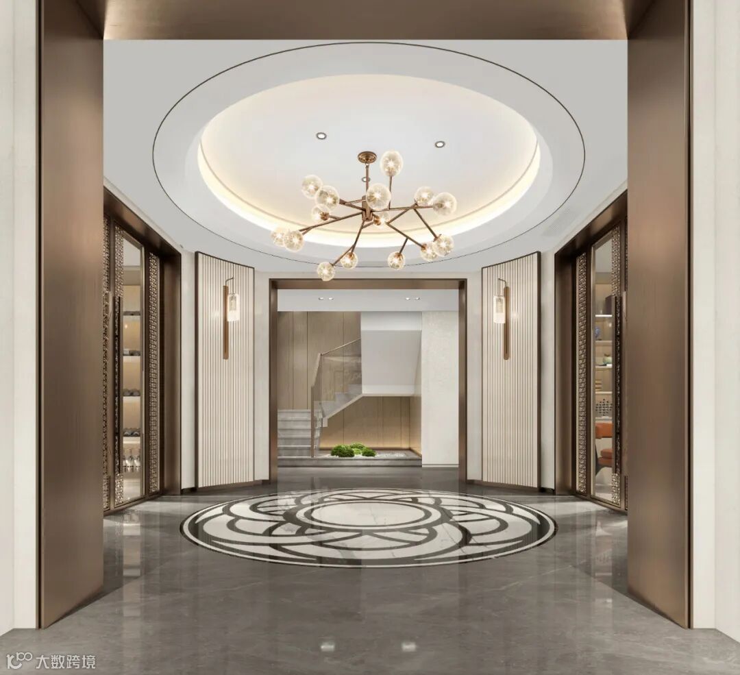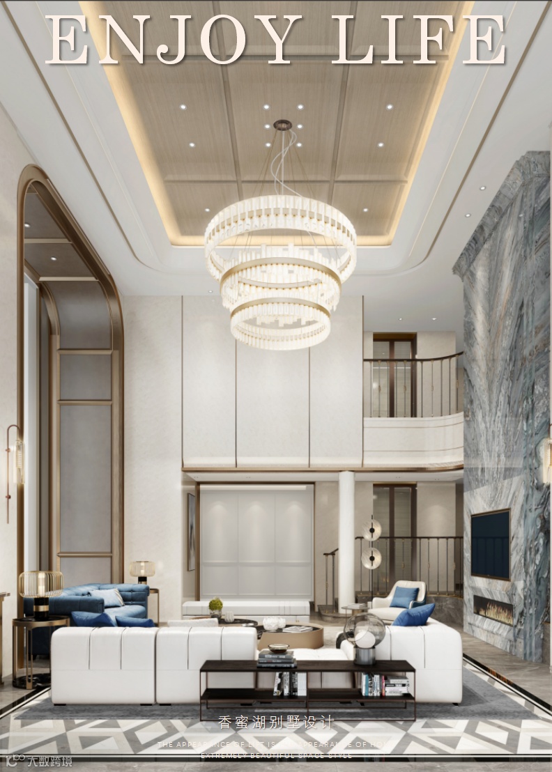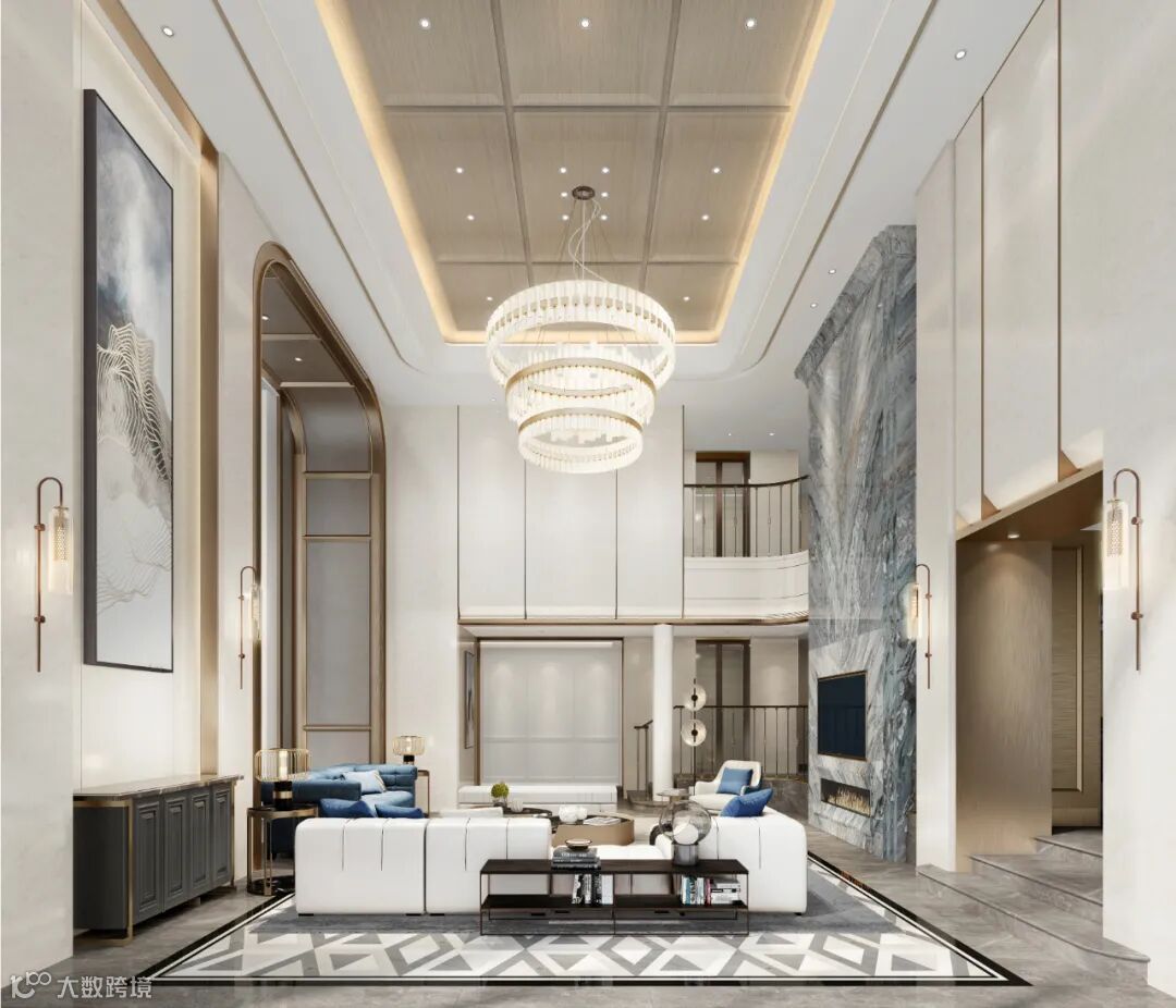 优雅缱绻的华丽客厅兼顾奢华于细节,石质的粗犷且细腻的脉理肆意蔓延,艺术的蕴含与生活的意趣交融协奏。局部面积的金属光面,折射出冷淡优雅氛围,静坐其间,感知精致美学的生活态度。石材的运用提升了空间的整体质感,随性洒脱的纹路与精致的软装相呼应,为开阔的视野点亮野性的光辉,迸发出奢雅、大气的空间张力。