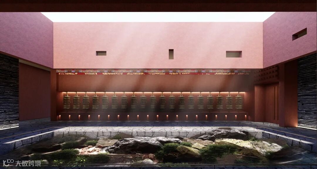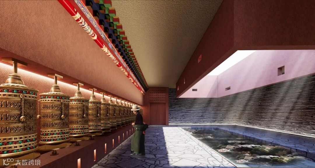 藏文化转经筒长廊保留了原有建筑的形态,以简一的造型语言对话建筑,神圣而威严。