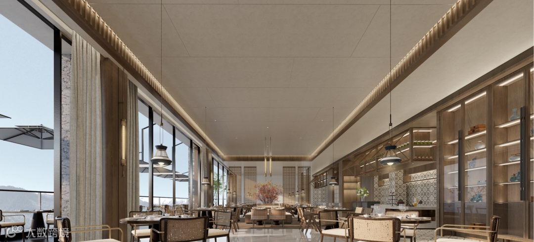 全日制餐厅整体以现代简洁的色调,营造舒适的就餐体验,考虑单人,双人,多人的就餐情况,采用少量藏式编制纹理的屏风,划分不同的就餐区域,满足不同客人的就餐需求,户外就餐区让客人在自然风光中享受悠闲、极致的美食体验。