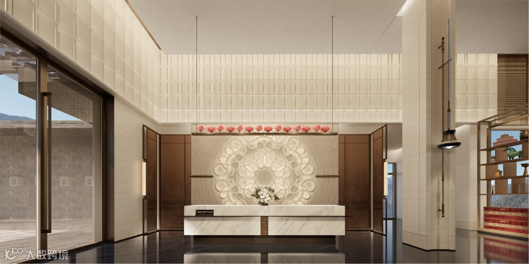 背景墙采用桃花的元素,从新设计组合成一个新的主题背景,即呼应了规划的主题又营造了空间新的记忆点,也增加了服务台的昭示性。