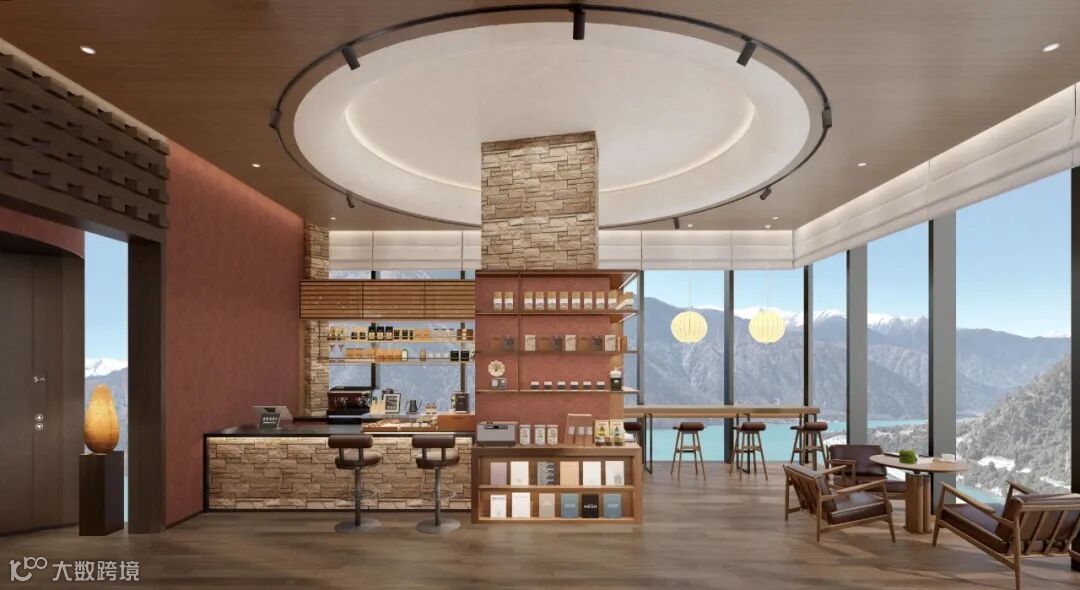 咖啡厅与文创空间坐落在视野最极佳的楼层,远眺圣湖和神山。