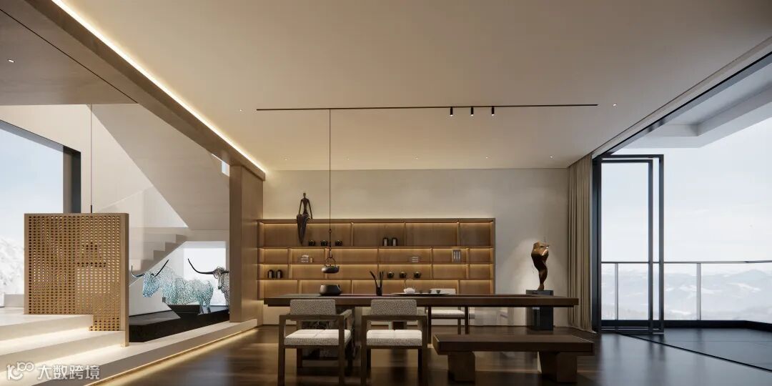 庭院置于群山之中,设计师通过一堵玻璃矮墙,将眼前风景极致呈现。