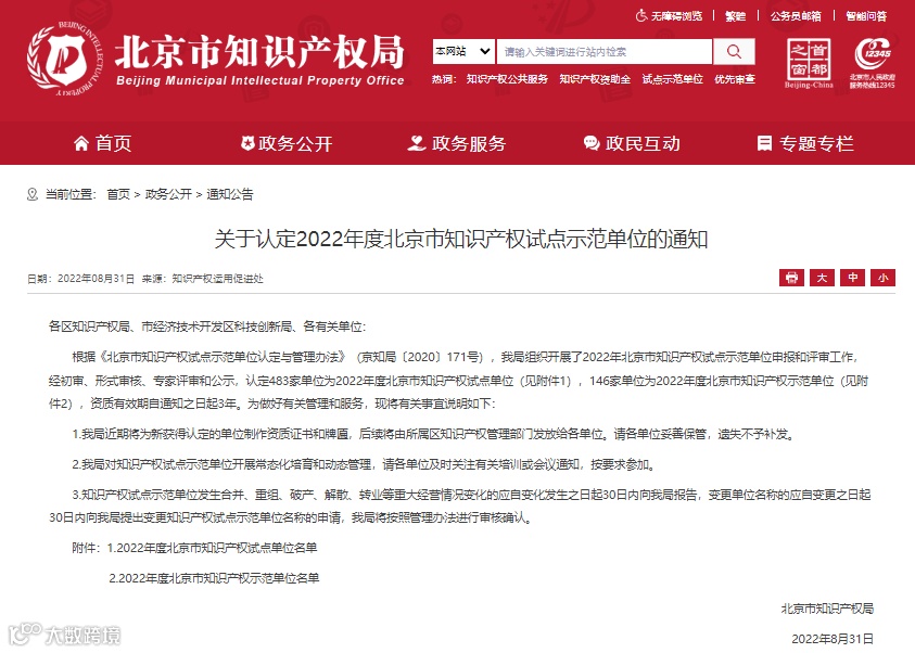 ► 2022年08月31日,根据《北京市知识产权试点示范单位认定与管理办法》(京知局〔2020〕171号),北京市知识产权局组织开展了2022年北京市知识产权试点示范单位申报和评审工作,经初审、形式审核、专家评审和公示,认定483家单位为2022年度北京市知识产权试点单位,146家单位为2022年度北京市知识产权示范单位,资质有效期自通知之日起3年。北京生态家园科技集团有限公司成功入选,被认定为“2022年度北京市知识产权试点单位”。