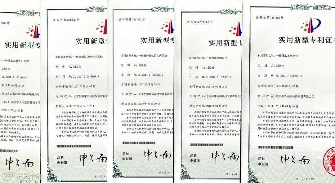 ►北京生态家园科技集团有限公司自成立以来,一直坚持创新,专注研发,深耕内墙底材产品二十二年,秉承着“保护环境、关注用户、呵护工长”的企业价值观,追求创新、务实笃行的做好产品和服务发扬工匠精神。值得一提是北京生态家园(乐亭)旗舰工厂早前也荣获了省级及行业双项研发机构和标准化实验室殊荣,同时也奠定了公司的研发能力及可持续发展性,表明着公司在知识产权布局、科研经费投入、专利的申报、知识产权运用等方面的重视与投入。经过公司多年的努力,在知识产权上也取得了骄人的成绩,截至目前,已申请获得实用新型专利数百项,发明专利数十项,先后参编多项行业标准的制定。