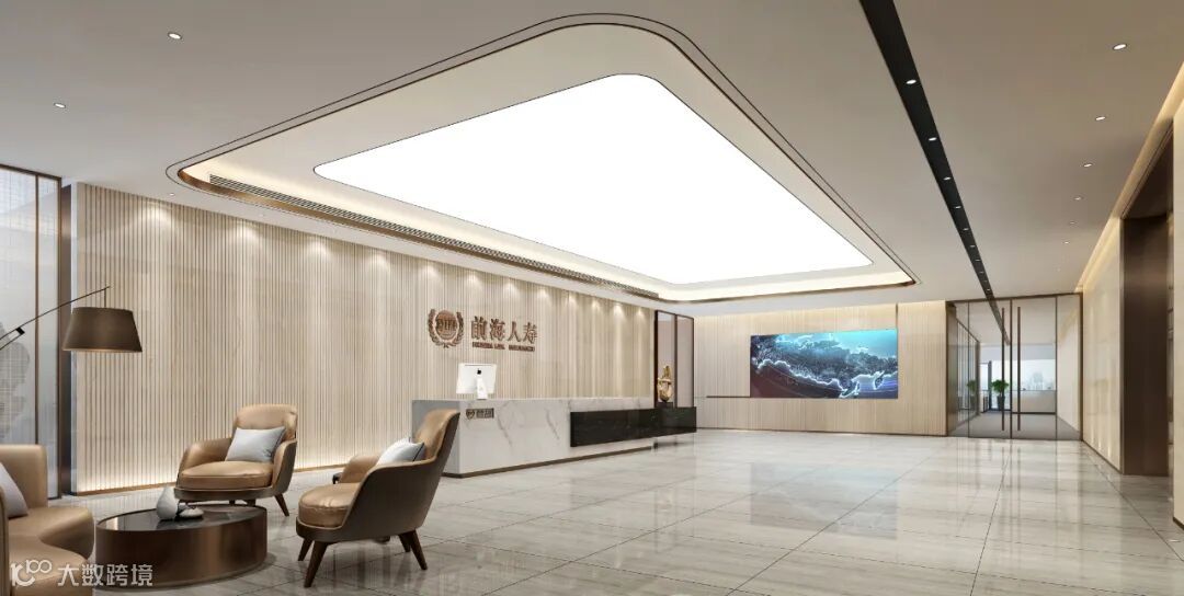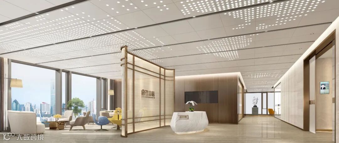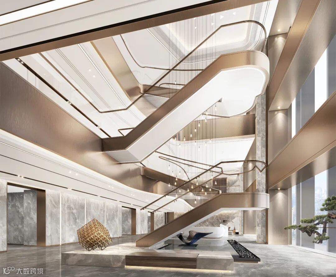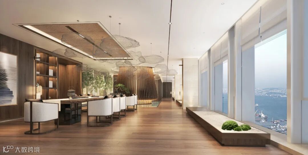 五十六层高管层办公大堂,设计通过对建筑结构的再次优化、改造,在原来平层建筑空间中创造出三层挑高的中庭空间,俯瞰前海,视野开阔大气、高贵典雅的空间彰显集团企业的国际化形象。