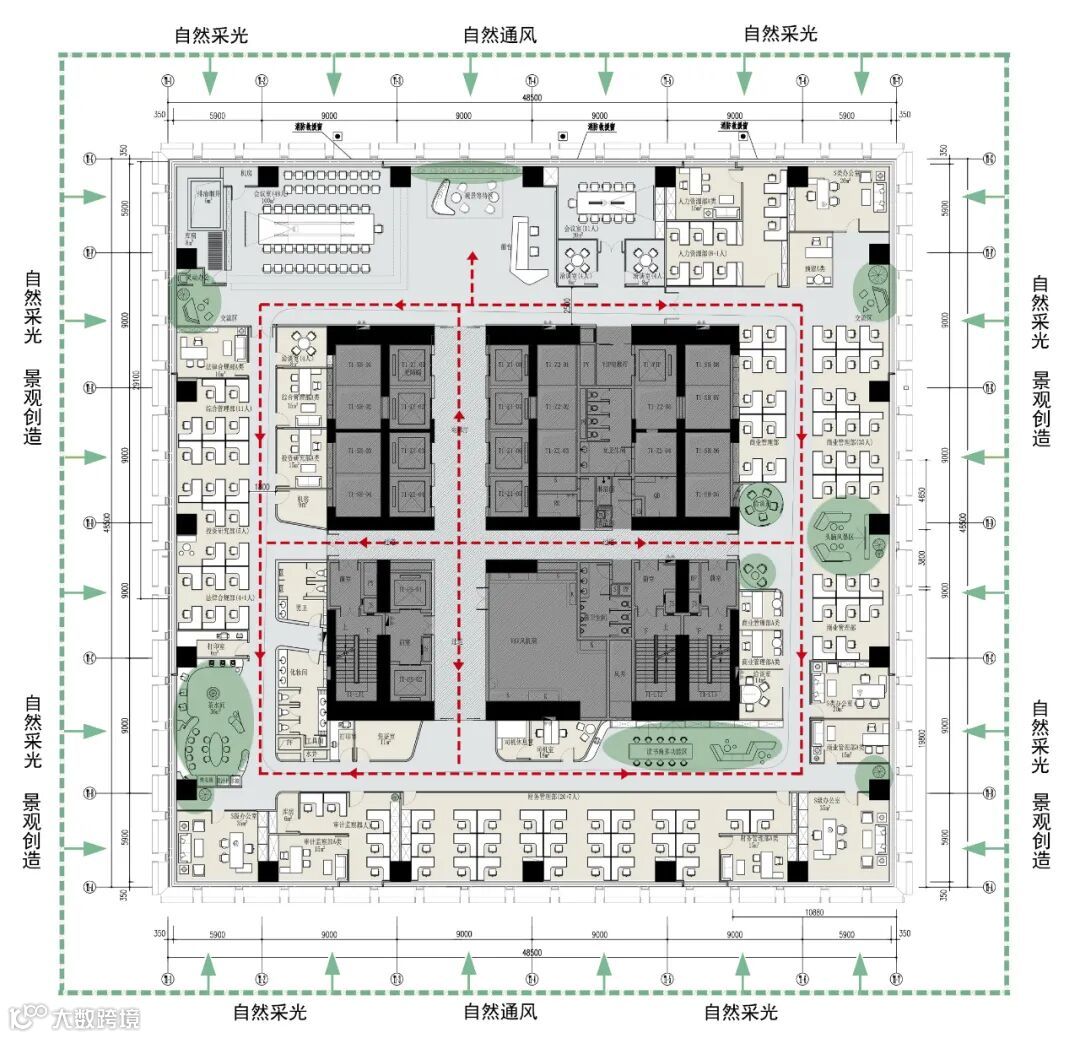在满足使用要求的前提下,结合当代美学思想与科技,融入自然采光和绿色景观创建的设计理念,注重员工的交流共创,提倡灵动办公、绿色办公、健康办公、乐享办公、休闲办公、创意办公、智慧办公、多元办公、品质办公、人文办公,多元化空间,设计使办公人员跳出时间和空间的束缚,激发员工工作激情与协同创造力,体现超前的时代精神和高品质的办公环境。