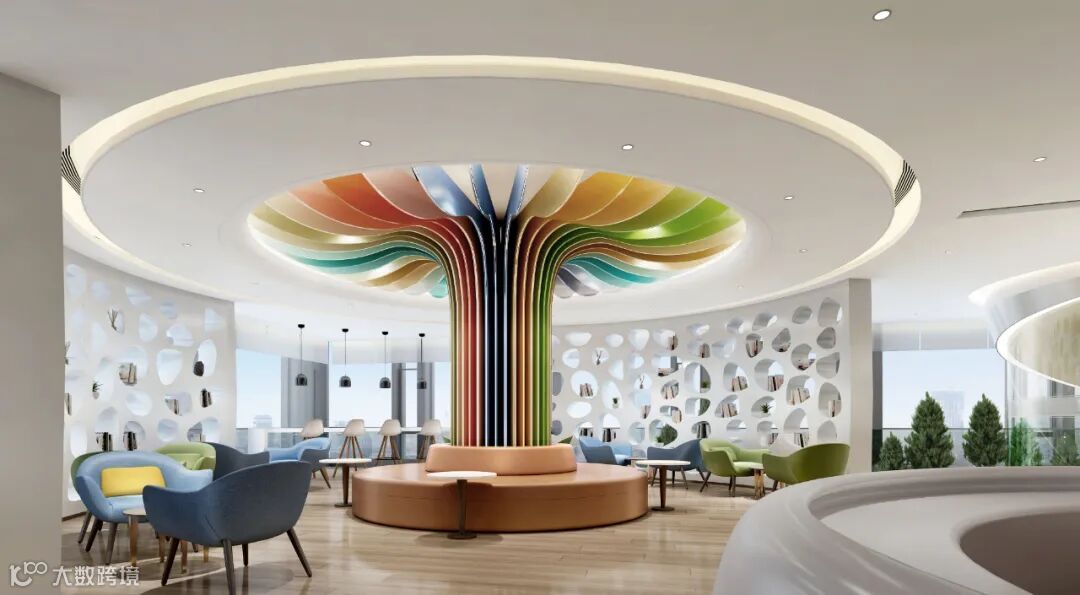设计不仅要打造美观的室内环境,更要策划和定位创新有机结合,提出综合性设计方案。通过设计艺术演绎企业文化和精神属性,设计从宝能企业logo提取视觉元素和企业的发展理念,并通过设计的艺术手法将企业的形象色构成一颗发展树。将其融入整栋办公空间,寓意着各业态公司在宝能集团的引领下,各个版块不断发展,共融共创、繁荣发展,共创辉煌的设计愿景!