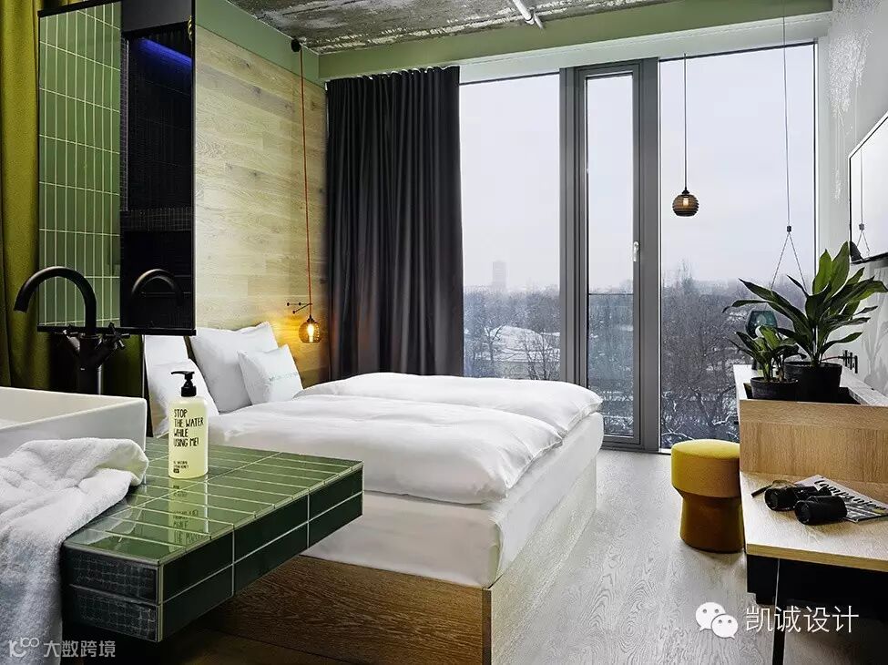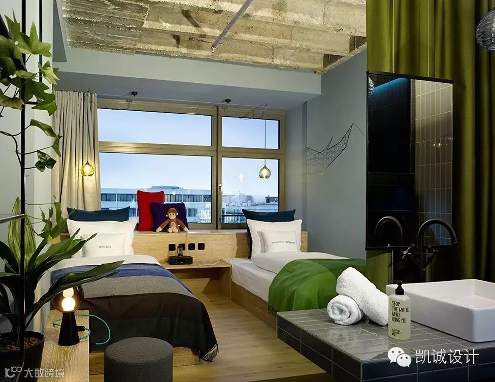 酒店以“荒野丛林”为设计主题,散发着浓郁的丛林野性魅力。原始人的皮毛吊床、层层爬高的绿植、自由穿梭的吊绳、随处可见的玩偶猴以及原始采暖设施等细节皆展现了充满原始趣味的丛林风貌。此外,酒店的屋顶露台可360度观赏极致的城市风景,且将附近的蒂尔加滕公园一览无余。