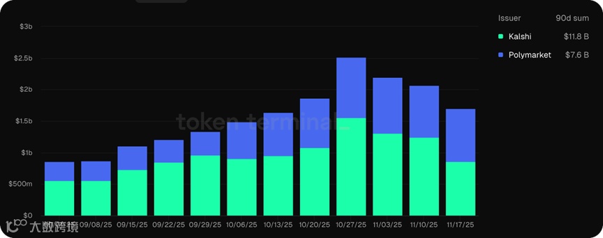 这次监管批准是否能帮助 Polymarket 迅速缩小与竞争对手 Kalshi 的差距还有待观察。在过去 3 个月中,Kalshi 始终保持明显领先,尤其在机构流动性、交易量和用户增长方面。