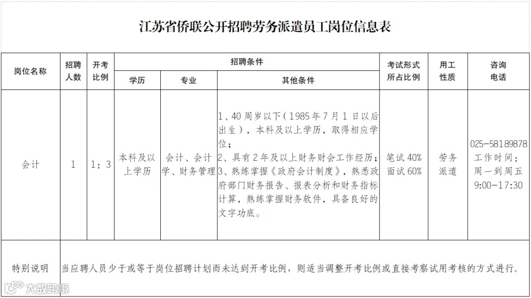 此次招聘由江苏省侨联进行全过程监督,从事公开招聘工作的负责人员及其工作人员与应聘人员有亲属关系的,应当回避,监督电话:025-83580529。