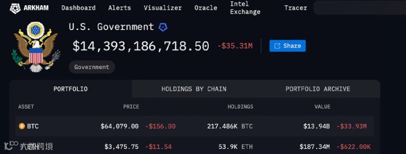 6月24日,Arkham数据显示,美国政府目前持有217,486枚比特币,价值约139亿美元,还持有53,900枚以太坊,价值约1.87亿美元。