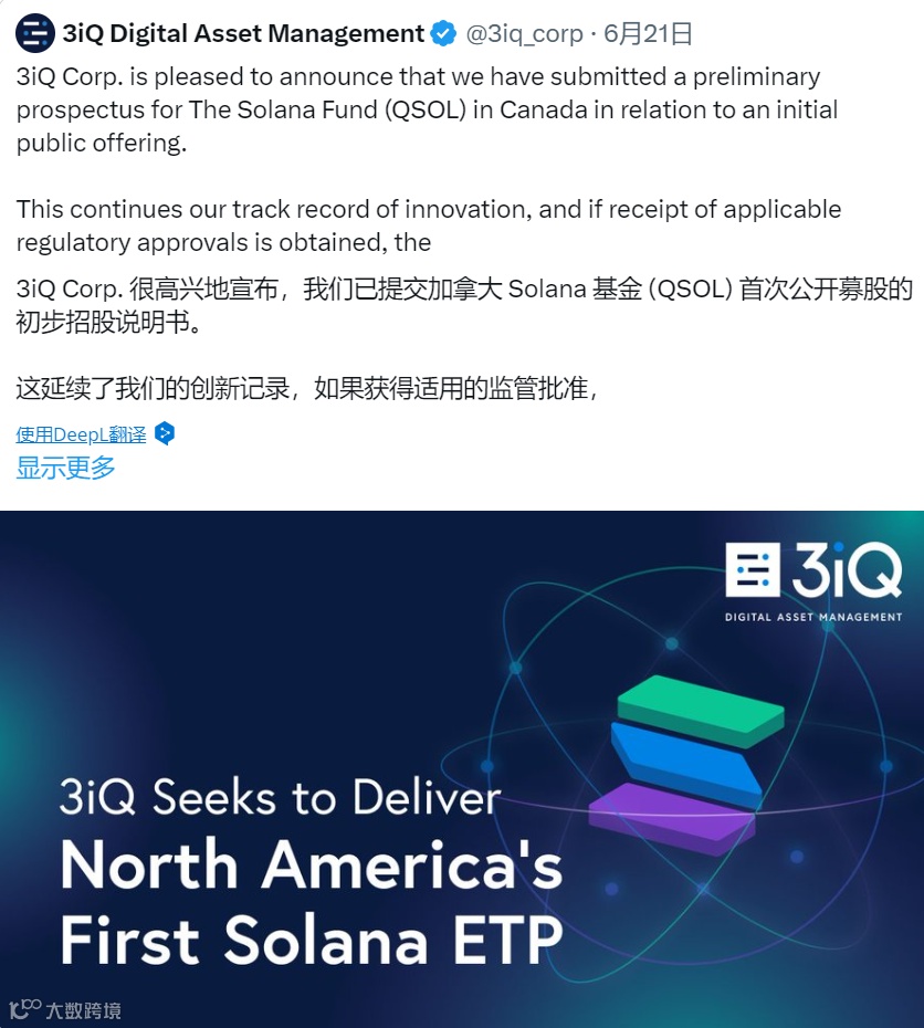 6月21日彭博分析师James Seyffart推特发文称,3iQ刚刚提交在加拿大推出Solana ETF的申请,计划使用代码QSOL。