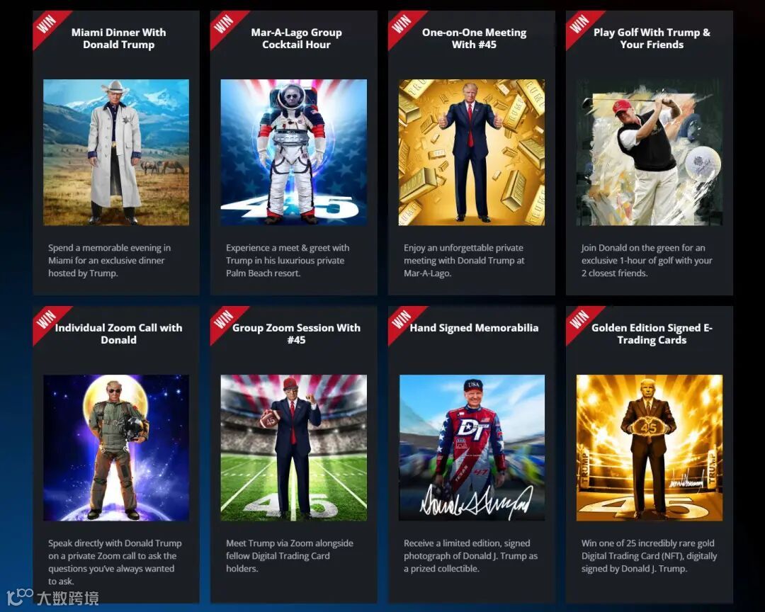 购买 75 个 NFT(价值 7425 美元)以上,就可以获得和特朗普在佛罗里达州共进晚餐的机会,以及限量版球鞋等多项权益。