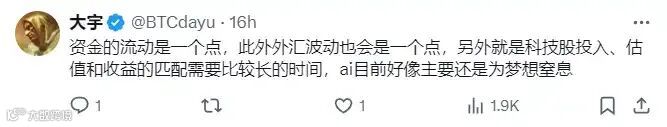 加密 KOL 大宇观点:资金的流动是一个点,此外外汇波动也会是一个点,另外就是科技股投入、估值和收益的匹配需要比较长的时间,ai 目前好像主要还是为梦想窒息。