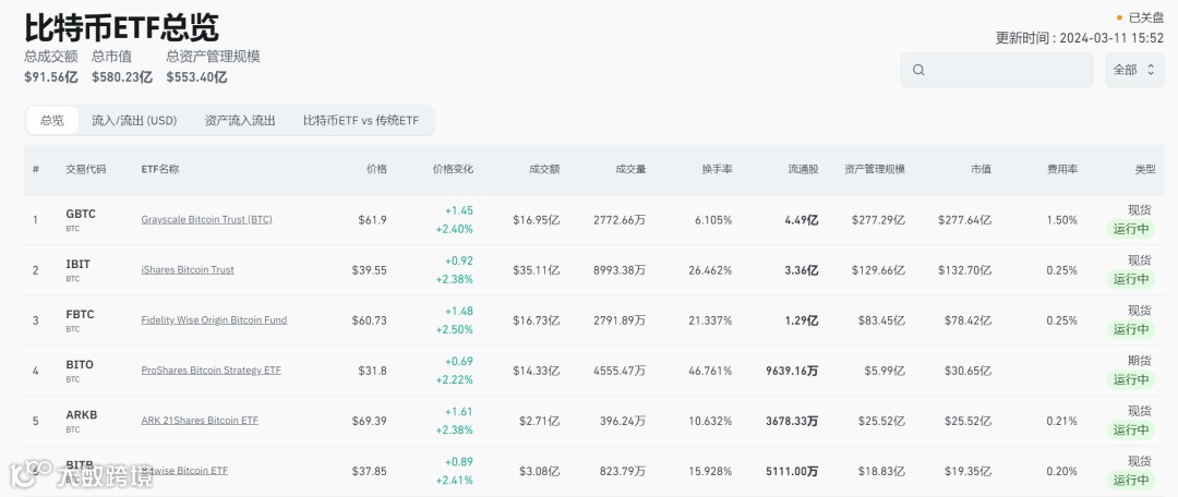 3月10日,Coinglass数据显示,比特币ETF总资产管理规模达553.4亿美元。其中排名前三的比特币ETF分别为灰度GBTC(277.29亿美元)、贝莱德IBIT(129.66亿美元)、FBTC(83.45亿美元)。